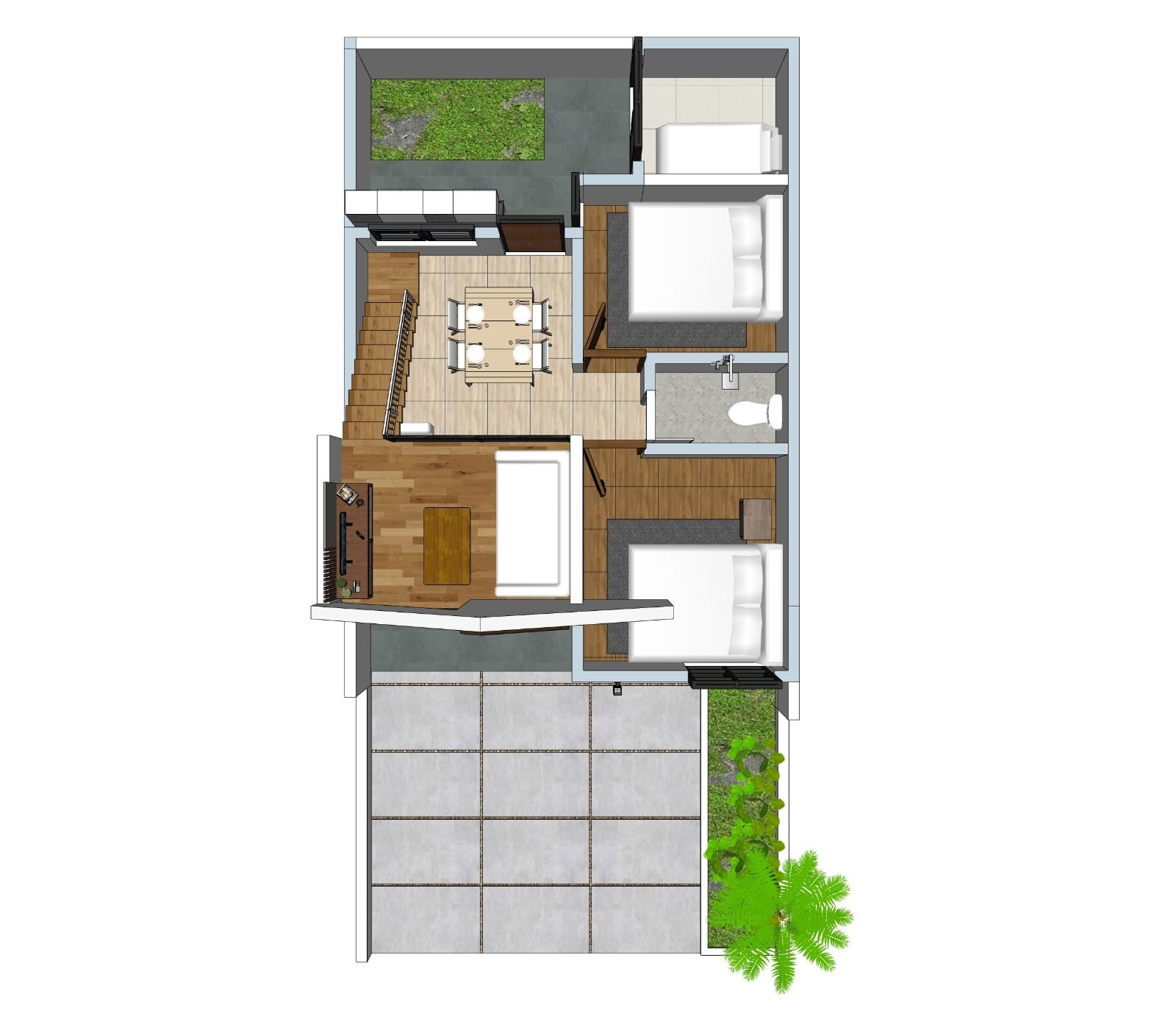 Hunian modern bergaya Scandinavian dengan konsep mezzanine yang menghadirkan ruang lebih luas, fungsional, dan estetik. Dirancang untuk keluarga muda yang menginginkan kenyamanan dan efisiensi ruang, tipe mezzanine menawarkan area tambahan yang dapat difungsikan sebagai kamar tidur, ruang kerja, ataupun ruang hobi.